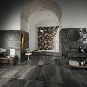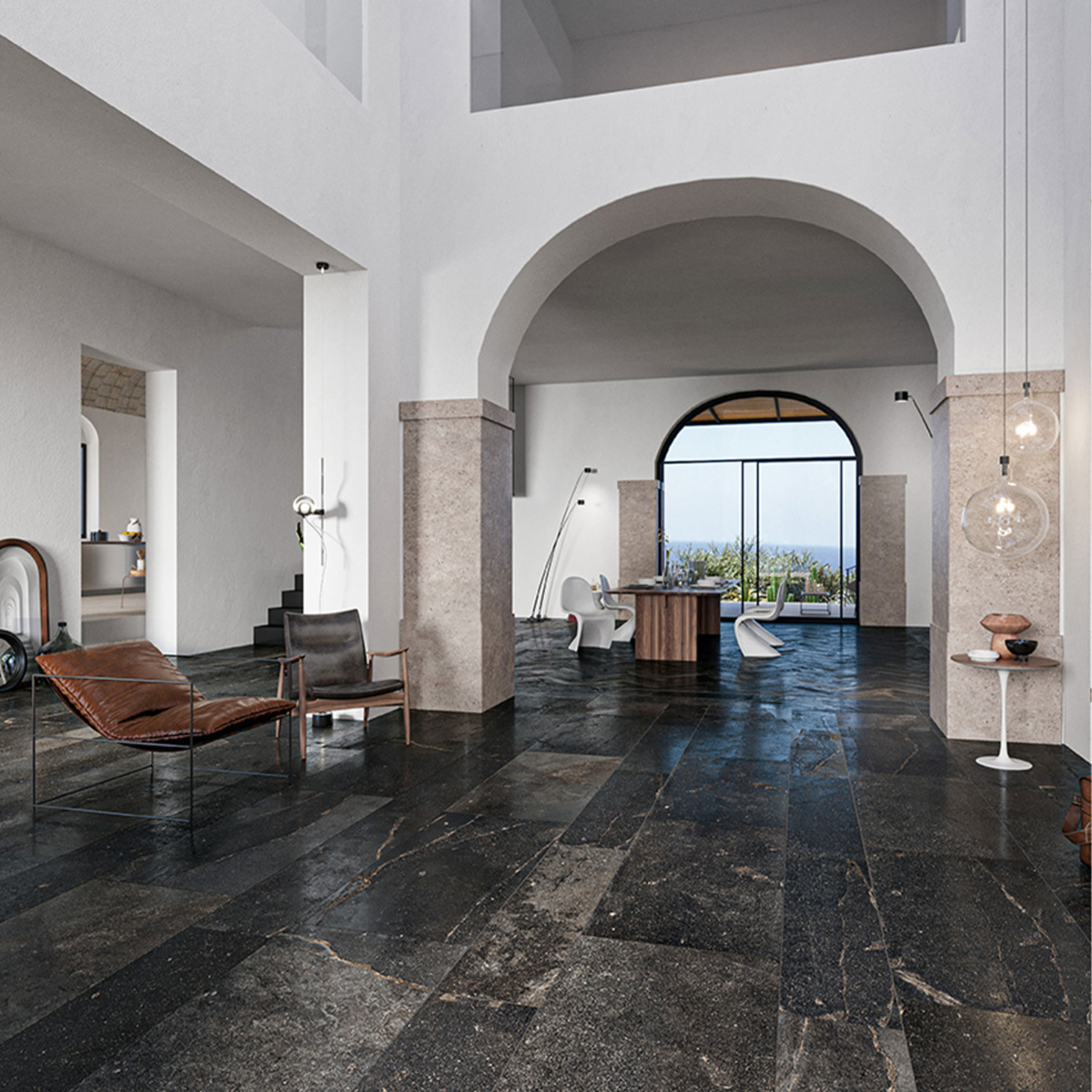 La série de carreaux en grès cérame Ibla s’inspire de la pierre d’asphalte, de Raguse. Elle se décline en quatre variantes élégantes allant du noir au blanc, du gris au beige, associées à un style de design qui s’inscrit dans la réhabilitation de bâtiments anciens de prestige, avec des insertions résolument contemporaines.
