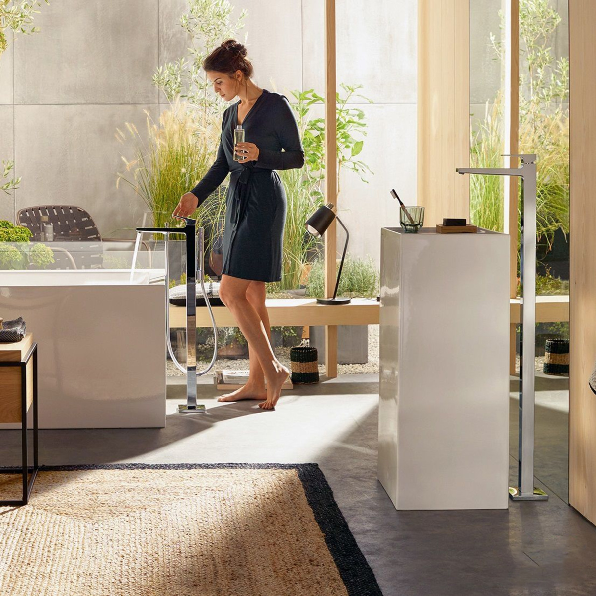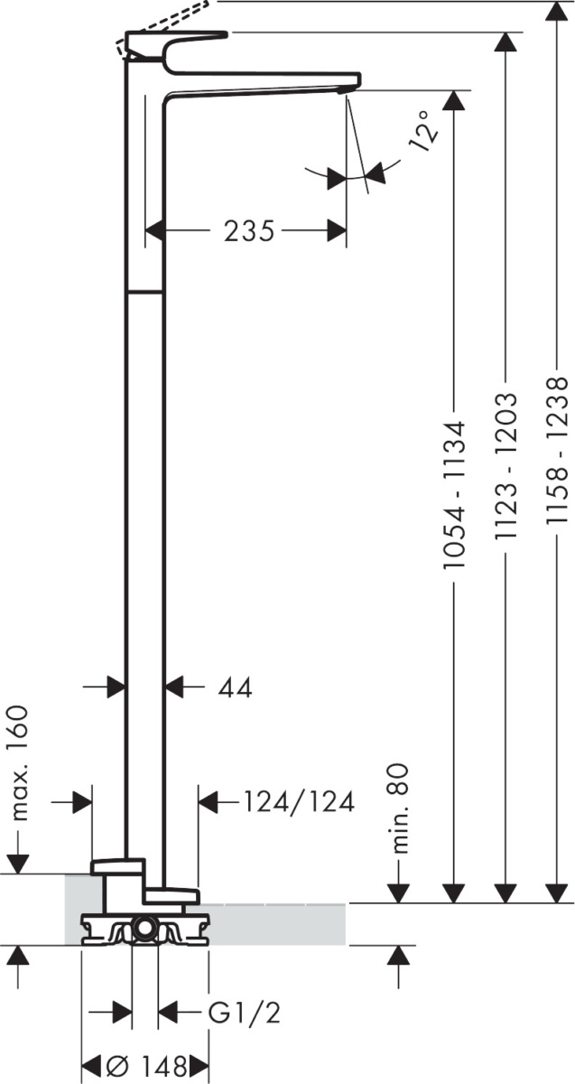 Mitigeur de lavabo chromé encastré au sol, poignée manette, sans tirette ni vidage. Avec corps d’encastrement pour mitigeur encastré au sol.
