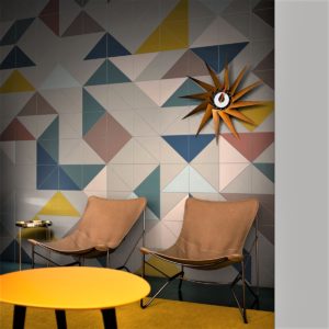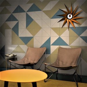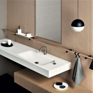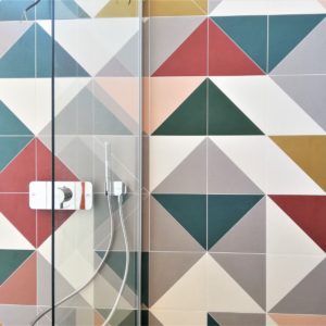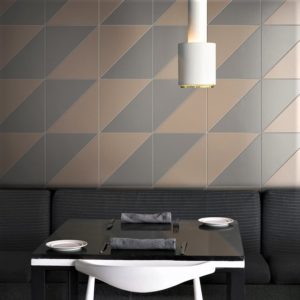 Le choix de la teinte unie mat est enrichie avec une texture , qui rappelle la trame d’une toile imprimée sur le carreaux